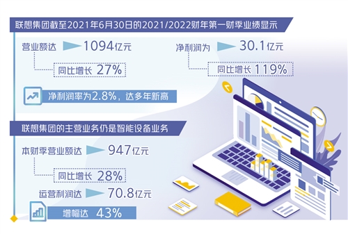 联想集团8月11日公布了截至2021年6月30日的2021/2022财年第一财季业绩,营业额达1094亿元人民币,同比增长27%;净利润为30.1亿元人民币,同比增长119%;净利润率为2.8%,达多年新高。