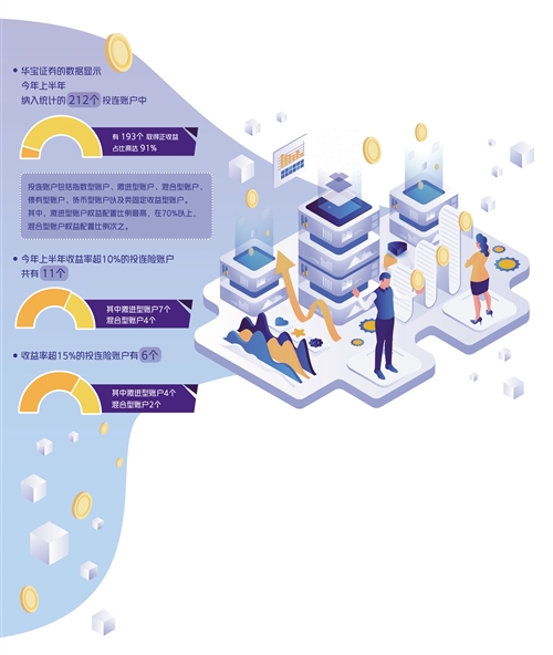投连险全称投资连结保险,集保障与投资于一体,保单在提供人寿保险时,其价值与保额取决于投资成绩。来自华宝证券的数据显示,今年上半年,纳入统计的212个投连账户中,有193个取得正收益,占比高达91%。