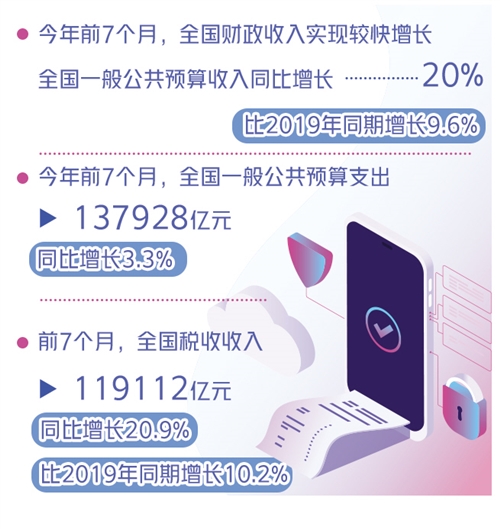 财政收入是经济发展形势的“晴雨表”,今年前7个月,全国财政收入实现较快增长,全国一般公共预算收入同比增长20%,比2019年同期增长9.6%。同时,各级财政持续压减非急需非刚性支出,抓好常态化财政资金直达机制落实,“三保”等重点领域支出得到有力保障。