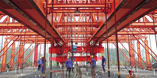 八月二十九日,常泰长江大桥江苏常州段公路引桥首个连续箱梁开始浇筑,标志着全线上部结构施工开始。陈 暐摄(中经视觉)