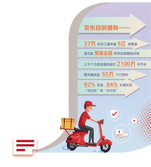 京东是如何“助攻”的呢?曾晨介绍说,目前,京东运营着数百万自营商品SKU(库存量单位),37万名员工服务着5亿消费者,建立起覆盖全国的供应链基础设施,上千个仓库总面积超过2100万平方米,服务触达超55万个行政村,92%区县、84%乡镇实现“当日达”或“次日达”。同时,京东开放自身积累的数字技术和供应链能力,为数百万合作伙伴打开增长新空间。