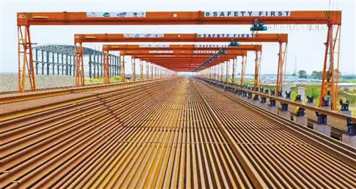 近日,雅万高铁最后一批钢轨运抵印度尼西亚芝拉扎港,首批中国中铁电气化局生产的“中国牌”简统化高铁接触网产品也供货完毕,中国高铁整体出口“第一单”进展顺利。图为万隆雅万高铁铺轨基地。桑军阳摄(中经视觉)