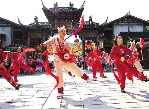 ⑥10月3日,在江苏句容市宝华山国家森林公园,游客观看腰鼓表演。 钟学满摄(中经视觉) |