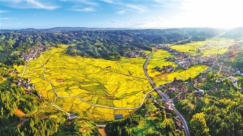金秋时节,贵州天柱县万亩大坝稻谷飘香,林下产业硕果累累,处处呈现出一派丰收喜人的景象。