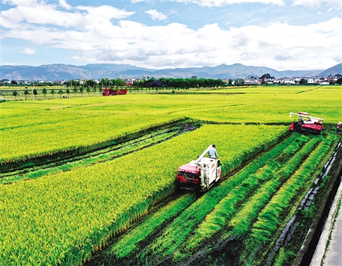 10月19日,工人在大理市湾桥镇水稻绿色种植基地收割水稻。当日,云南省大理市“洱海留香”绿色水稻种植基地开镰。近年来,云南农垦集团在大理市环洱海流域开展规模化绿色有机优质水稻种植,打造出特色大米“云粮·洱海留香”。 梁志强摄(新华社发)
