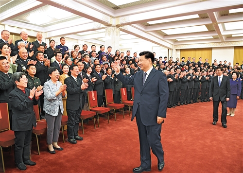 上午11时,习近平等来到人民大会堂北大厅,全场响起热烈掌声。习近平等走到代表们中间,同大家亲切交流并合影留念。