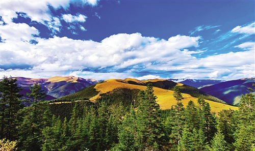 11月1日,四川省甘孜藏族自治州雅江县香格宗乡的G318国道剪子湾山口,蓝天白云下,一道道山梁层林尽染,草场金黄、雪松碧绿,尽显秋日美景。