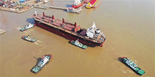 11月3日,江苏南通通州区象屿海洋装备的一艘63500DWT(载重吨)散货船顺利出坞。2017年以来,南通象屿承接了28艘63500DWT散货船,目前已顺利交付26艘,该船型配备了先进的压载水管理系统,在绿色、环保、节能方面处于领先水平。许丛军摄 (中经视觉)