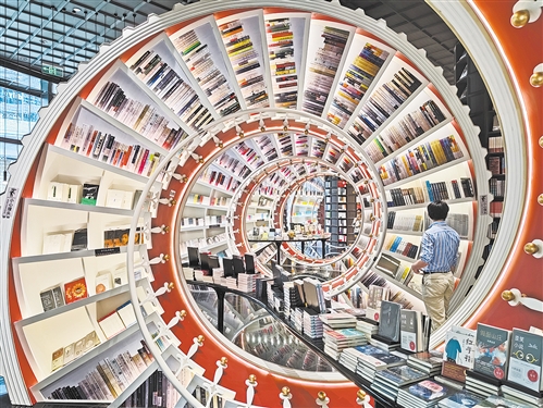 近日,钟书阁深圳首店开业。店内融入多种设计元素,红色巨型艺术装置的优雅曲线象征深圳“历史之阶梯”,打造了极为丰富的文化空间。邹碧雄摄(中经视觉)