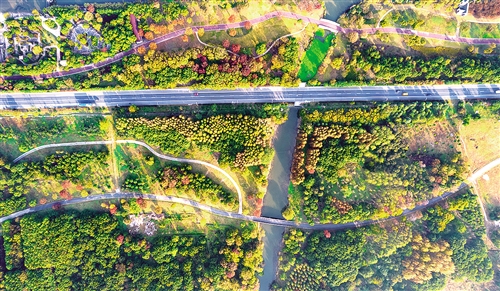 十一月十七日,江苏省太仓市新港公路、苏昆太高速公路两侧的树木色彩斑斓。近年来,当地不断提升公路沿线生态绿化水平,建设多彩廊道、绿色通道、生态廊道。