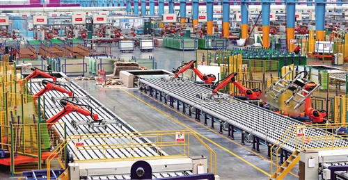 12月9日,安徽省滁州市凤阳硅谷智能公司的机器手正在有序作业。该公司依托当地丰富的石英砂资源,自主研发生产的大尺寸超薄超白特种光电玻璃产品,受到市场欢迎。李晓村摄(中经视觉)