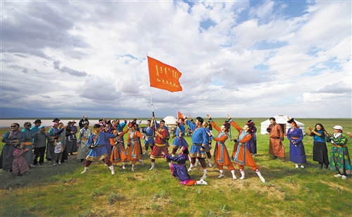 广大文艺工作者积极投身新时代中国特色社会主义伟大实践,倾情服务人民,倾心创作精品,为中华民族伟大复兴凝聚起磅礴精神伟力。图为内蒙古苏尼特右旗乌兰牧骑队员在牧区演出。东哈达摄(新华社发)