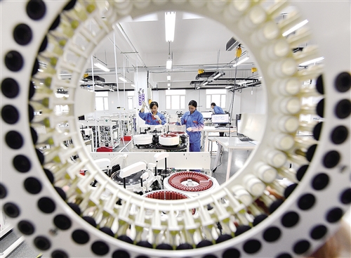 近日,河北省迁安高新区,艾驰生物科技有限公司工人在检测仪器性能。近年来,迁安市不断培育壮大新兴产业,跻身中国县域科技创新百佳县市。陈 儒摄(中经视觉)