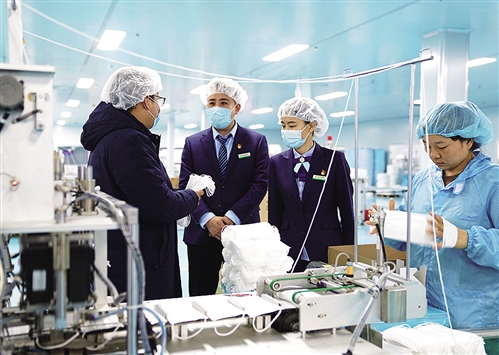 河北元氏农商银行坚持聚焦普惠金融定位,让金融服务惠及县域。图为2021年12月20日该行信贷工作人员(左2、左3)实地考察河北汇康日用品有限公司运行情况,为公司介绍信贷政策。 赵登辉摄(中经视觉)