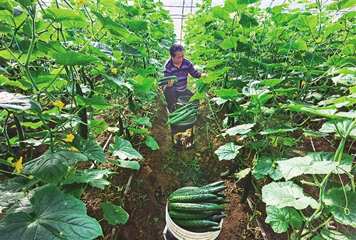近日,在山东省聊城市东昌府区道口铺街道办事处新建的果蔬大棚里,农民在采摘黄瓜。近年来,当地整合乡村振兴补助资金,吸引多种资金参与,开发建设农业基地,建立起集育苗、蔬菜种植于一体的“致富大棚”。农民在领取“分红”的同时又可以在农业基地挣工资,实现家门口就业。 苗广杰摄(中经视觉)