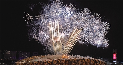 二月四日晚,第二十四届冬季奥林匹克运动会开幕式在北京国家体育场举行。这是焰火表演。