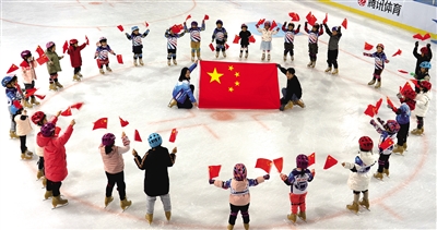 2月4日,江苏省徐州市奥体冰上运动场“乐享冰场迎冬奥”嘉年华活动举行。小队员手持国旗,祝福北京冬奥会圆满成功。