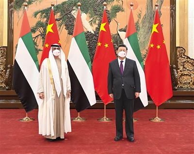 习近平指出,近年来,中阿关系保持高水平发展,成为中国同中东国家关系典范。双方深入开展抗击新冠肺炎疫情合作,克服疫情不利影响稳步推进各领域务实合作。中方视阿联酋为好朋友、好伙伴、好兄弟,愿同阿方一道,把握两国友好大方向,打造面向新时代的中阿全面战略伙伴关系。