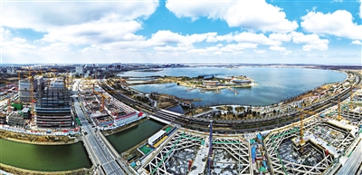 2月10日在中国(上海)自由贸易试验区临港新片区拍摄的滴水湖畔建设工地一景。