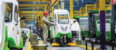 2月11日,安徽省芜湖市繁昌经济开发区爱瑞特公司生产车间内,工人在生产线上作业。新春伊始,订单需求旺盛,企业开足马力,全力生产新能源电动清扫车。 肖本祥摄 (中经视觉)