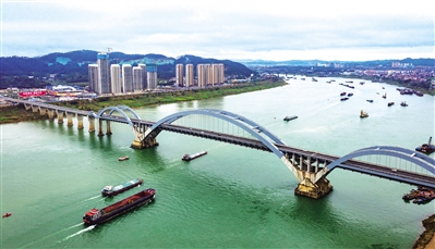 2月13日,无人机航拍广西梧州西江河段。新年伊始,素有“黄金水道”之称的梧州西江河段上,一艘艘满载煤炭、钢材等货物的船舶有序航行,呈现一派繁忙景象。
