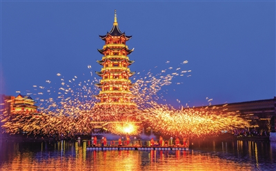2月13日,湖北荆州方特东方神画主题乐园进行打钢花民俗表演。春节以来,荆州通过开展新春集市、非遗民俗展演、篝火晚会、烟火秀等形式多样、内容丰富的夜间游玩活动,吸引游客参与,激活了夜间文旅消费市场。