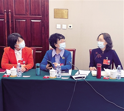 3月7日下午,十三届全国人大五次会议山西代表团举行小组会议,审议关于十四届全国人大代表名额和选举问题的决定草案。全国人大代表王润梅、辛琰、赵立欣(从左至右)就草案相关问题进行交流。本报记者 孟 飞摄