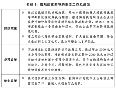 (二)创新和完善宏观调控,经济基本盘进一步巩固。加快构建新发展格局,加强宏观政策跨周期调节,做好保供稳价工作,加大助企纾困力度,实现了较高增长和较低通胀的优化组合,经济保持较好发展态势。