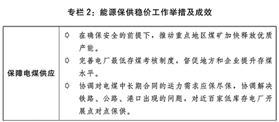 三是粮食能源等重要资源保供稳价工作有力有效。针对玉米、煤炭、铁矿石、铜铝锌等大宗商品价格异常波动,及时采取供需双向调节、期现货市场联动监管、预期引导等措施,打出保供稳价的政策组合拳,有力促进了价格回归合理区间。加强粮食市场调控,合理安排进口和政策性粮食库存销售,有效保障粮食市场稳定供应。加强期货市场监管和新棉收购引导,适时增加中央储备棉投放,促进棉花市场平稳有序运行。着力解决煤炭电力供应紧张问题,推动煤炭增产增供和价格回归合理水平,支持发电供热企业纾困解难,提升煤电支撑保障能力,改革完善煤电价格市场化形成机制,扩大市场交易价格上下浮动幅度,加强煤炭、液化天然气(LNG)等能源物资产运需衔接和运输保障,确保民生和公共用能需求,推进全社会节约用电。发挥跨部门协调工作机制作用,做好化肥市场保供稳价工作。制定实施原材料价格上涨应对方案以及分品种保供稳价工作方案。发挥国家储备市场调节作用,分批投放原油成品油和铜铝锌等国家储备。
