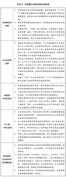 一是区域重大战略深入实施。北京非首都功能疏解取得新突破,国务院印发《关于支持北京城市副中心高质量发展的意见》,雄安新区进入大规模建设阶段,落实支持天津滨海新区高质量发展的意见,张家口首都水源涵养功能区和生态环境支撑区加快建设。长江经济带生态优先、绿色发展深入推进,生态环境突出问题整改和污染治理“4+1”工程稳步推进实施,生态环境系统保护修复成效明显,长江十年禁渔实现良好开局,水生生物资源逐步恢复,沿江综合交通运输体系加快构建,长江保护法正式实施。粤港澳大湾区建设稳步推进,中共中央、国务院印发《横琴粤澳深度合作区建设总体方案》、《全面深化前海深港现代服务业合作区改革开放方案》,基础设施和公共服务融合有序开展。长三角一体化发展深入推进,基础设施互联互通水平持续提升,一体化发展体制机制不断优化,中共中央、国务院印发《关于支持浦东新区高水平改革开放 打造社会主义现代化建设引领区的意见》,构建长三角世界级港口群形成一体化治理体系、共建虹桥国际开放枢纽等重大任务有力推进,生态绿色一体化发展示范区建设取得显著成效。“十四五”黄河流域生态保护和高质量发展实施方案印发,农业、工业、城镇生活和尾矿库污染“3+1”综合治理方案扎实推进,污染防治、生态保护修复、深度节水控水、水土保持等领域重大工程项目稳步实施,在黄河省区完成1.2万平方公里水土流失治理任务。
