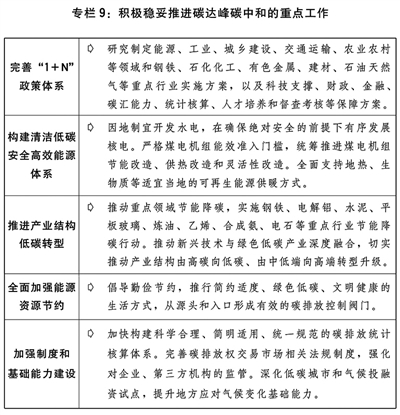 二是积极稳妥推进碳达峰碳中和。完善碳达峰碳中和“1+N”政策体系,实施“碳达峰十大行动”,坚持“全国一盘棋”。大力发展非化石能源,建设大型风电、光伏基地项目,积极发展分布式新能源,积极推动海上风电集群化开发,稳妥推进西南等地大型水电基地建设,大力发展抽水蓄能,在确保绝对安全的前提下积极有序发展核电,推进煤炭清洁高效利用。提升电网对可再生能源发电的消纳能力。做好全国碳排放权交易市场第二个履约周期管理。实施节能降碳改造升级。积极研究开发碳捕捉利用与封存技术。优化完善能耗双控政策,合理增加能耗总量弹性,新增可再生能源和原料用能不纳入能源消费总量控制,推动能耗“双控”向碳排放总量和强度“双控”转变。全面加强能源资源节约,强化工业、交通和建筑节能,不断降低单位产出能耗物耗和碳排放。对标能效标杆水平,推动能效低于基准水平的重点行业企业,有序实施改造升级,促进高耗能行业高质量发展。继续做好碳达峰碳中和及应对气候变化国际谈判与合作,主动参与全球绿色治理体系建设,加强绿色经贸、技术与金融合作。
