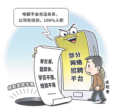 有社保、能双休、学历不限、经验不限,公司先培训,100%入职……在部分网络招聘平台上,此类信息并不少见。实际上,高额学费是真,高薪就业大概率是假,少量招聘甚至涉嫌传销活动,求职者应避免陷入这类求职“大坑”。网络招聘平台是落实稳就业政策的重要工具之一,亟须提升治理效能,严格执行行业规章,净化行业发展环境。一方面,平台应起到审核招聘方所提供信息真假的责任;另一方面,监管部门应及时出手,依法监管,倒逼企业提升合法合规水平,切实保护消费者合法权益。(时 锋)
