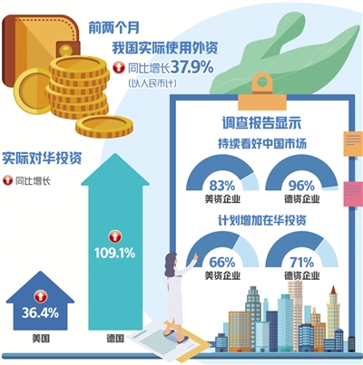 中国美国商会、中国德国商会近期发布的调查报告显示,83%的美资企业和96%的德资企业持续看好中国市场,66%的美资企业和71%的德资企业计划增加在华投资。今年前两个月,美国、德国实际对华投资分别增长36.4%和109.1%。其他主要外资来源地中,新加坡、韩国在华投资分别增长24.1%和24%,“一带一路”沿线国家、东盟分别增长27.8%和25.5%。
