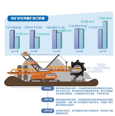 2月17日,国家发展改革委价格司、市场监管总局价监竞争局赴青岛开展联合监管调研,全面了解了青岛港铁矿石库存变化,并调取了库存增长较快的企业名录。同时,要求部分铁矿石贸易企业释放过高库存、尽快恢复至合理水平,并提供近期铁矿石库存变化、买进卖出的具体时间、数量和价格等详细情况,配合核查是否存在囤积居奇、哄抬价格等违法违规行为。