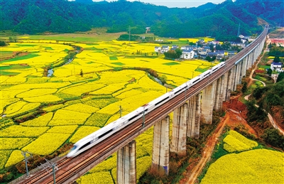 3月16日,江西省婺源县紫阳镇坑口村,一列高铁穿行在油菜花海中。