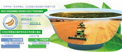 2月下旬,黑土地上还覆盖着厚厚冰雪,但春耕生产要提前打算。对于扩种大豆,黑龙江不久前出台《2022年黑龙江省扩种大豆工作方案》提出,2022年,全省大豆种植面积达到6850万亩,比2021年增加1000万亩以上;力争总产量达到170亿斤,比2021年增加26亿斤以上。