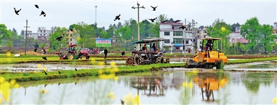 3月21日,江西永新县芦溪乡社园村早稻育秧基地,农机手驾驶农机翻耕田地,村民在翻耕好的田里播撒稻种。近年来,当地大力推进农田宜机化改造,有效提高劳动生产率和土地综合利用率,促进农业现代化发展。刘平华摄(中经视觉)