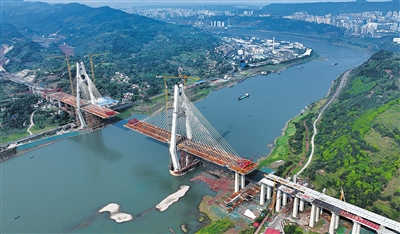 4月2日,在四川省宜宾临港公铁两用长江大桥项目现场,建设者正加紧施工。