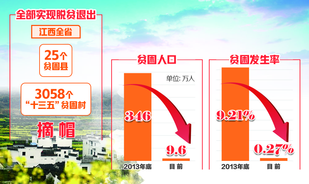 本报南昌4月26日电 记者赖永峰 刘兴报道:江西省政府新闻办26日召开新闻发布会宣布,经严格评估检查,于都县、兴国县、宁都县、赣县区、鄱阳县、修水县、都昌县等7个县(区)按程序退出贫困县序列。至此,江西全省25个贫困县、3058个“十三五”贫困村全部实现脱贫退出,贫困人口从2013年底的346万人减至9.6万人,贫困发生率从9.21%降至0.27%。