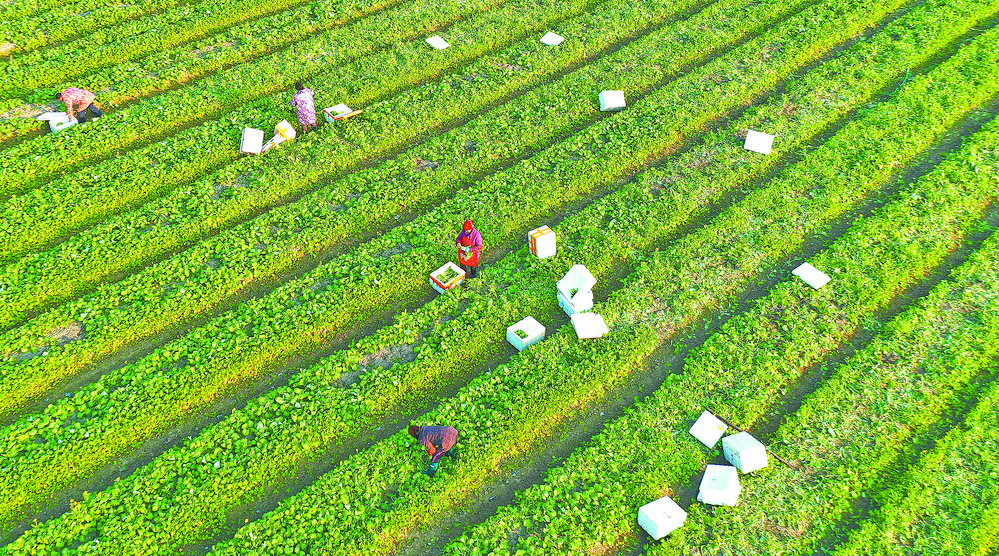 1月3日,湖南省道县梅花镇贵头村,村民在蔬菜基地里采摘菜薹。元旦假期,道县各外向型蔬菜基地一派忙碌的景象,农民及时采摘冬季蔬菜供应粤港澳大湾区。目前,道县蔬菜种植面积近20万亩,有16个基地成为粤港澳大湾区“菜篮子”产品备案基地。何红福摄(中经视觉)