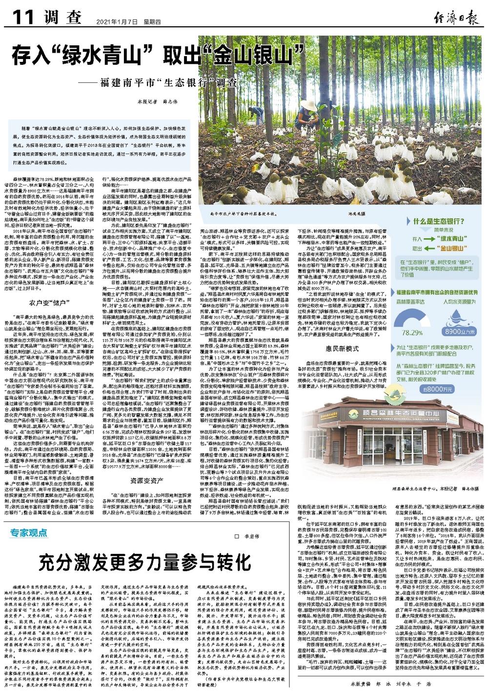 眼下,南平市正按照这样的思路持续推动“生态银行”创新实践进一步深化,在建阳区、顺昌县、延平区、光泽县、五夫镇等地建立生态产品价值科学评价体系、培养壮大运作主体、加大招商引资力度等,让“资源包”保值升值,尽最大努力把生态优势转变成发展优势。