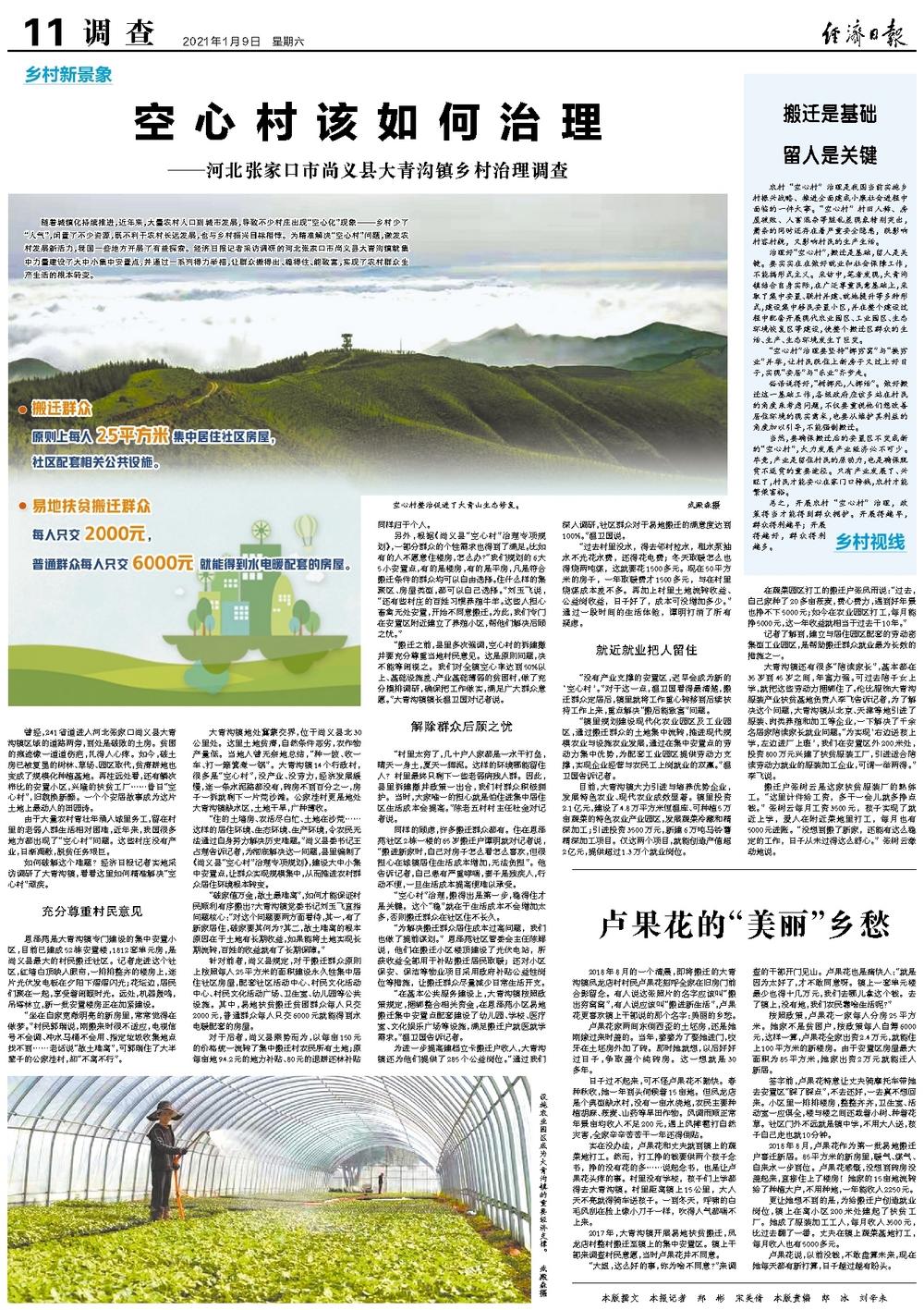 随着城镇化持续推进,近年来,大量农村人口到城市发展,导致不少村庄出现“空心化”现象—乡村少了“人气”,闲置了不少资源,既不利于农村长远发展,也与乡村振兴目标相悖。为精准解决“空心村”问题,激发农村发展新活力,我国一些地方开展了有益探索。经济日报记者采访调研的河北张家口市尚义县大青沟镇就集中力量建设了大中小集中安置点,并通过一系列得力举措,让群众搬得出、稳得住、能致富,实现了农村群众生产生活的根本转变。