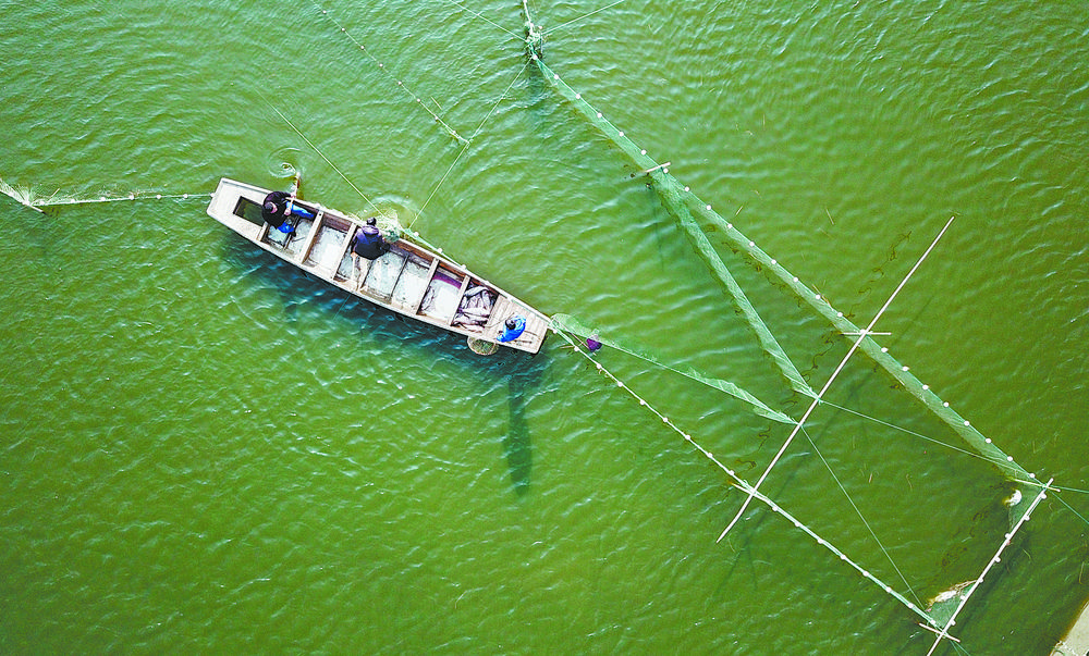 1月15日,在湖南省益阳市资阳区黄家湖渔场,工作人员在布置渔网(无人机照片)。 近年来,湖南省益阳市资阳区黄家湖渔场实施生态养殖,投放鲢鱼、鳙鱼等滤食性鱼种,全面禁止投饵施肥,收到良好效果,鲢鱼、鳙鱼等水产品受到市场欢迎。 新华社记者 陈泽国摄