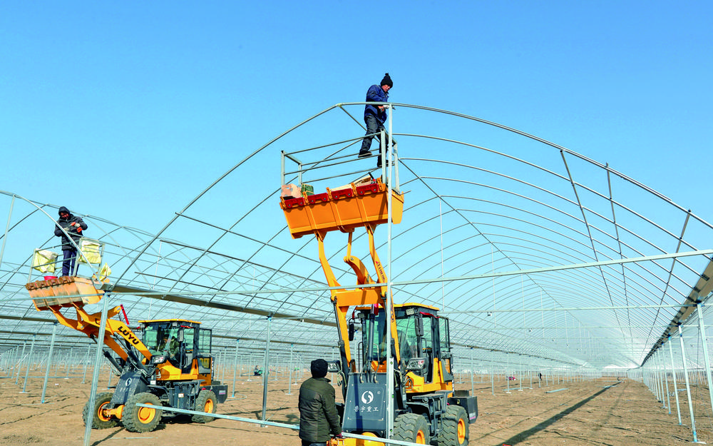 近日,安徽省蒙城县庄周街道九里桥村蔬菜基地,农民正在搭建蔬菜大棚。近年来,蒙城县不断加大区域特色蔬菜基地建设,目前全县已发展千亩以上蔬菜基地6个,有效促进农民增收和农村劳动力转移。 胡卫国摄(中经视觉)