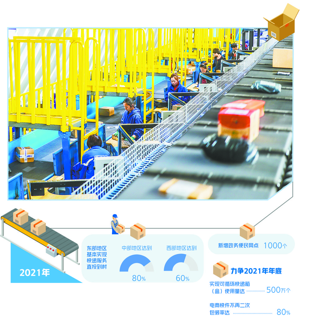 “2021年,要提高建制村快递服务通达率,东部地区基本实现快递服务直投到村,中、西部地区分别达到80%和60%。”国家邮政局办公室副主任侯延波日前在新闻发布会上表示,下一步,国家邮政局将落实快递进村三年行动方案,编制快递进村指引,明确进村标准,因地制宜推动邮快、交快、快快合作多模式并进,多品牌快递服务有效下沉,提高覆盖率,更好服务“乡村振兴”战略,“新增政务便民网点1000个,巩固提升建制村直接通邮成果,西部地区建制村每周三班以上投递比率超过95%”。