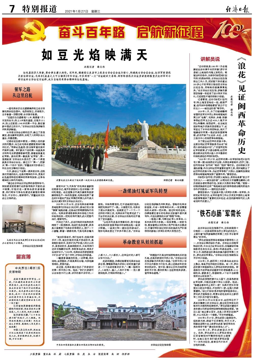 “1929年7月27日,红四军的第一份军报《浪花》(创刊号)(第一期)在闽西正式出版,为黑色单面铅印,四开二版,创刊号设有‘发刊词’‘特讯’‘短评’等栏目。这份报纸文字通俗易懂,作为当时红四军重要的宣传工具,很好地配合了红四军的武装斗争,为红四军争取广大群众、创建和发展闽西革命根据地等发挥了重要作用。”廖丽芸说。