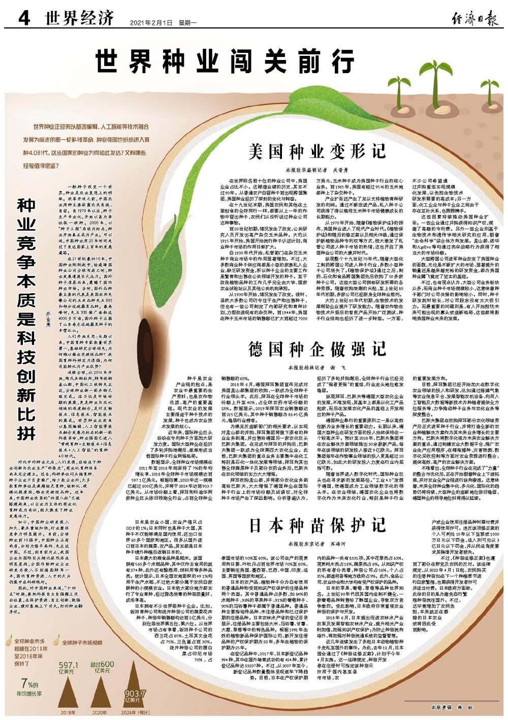2018年6月,德国拜耳集团宣布完成对美国孟山都集团的收购,一跃成为全球种子行业领头羊。此后,拜耳在全球种子市场的份额上升至40%,占全球农药市场份额的23%。数据显示,2019年拜耳农业销售额达到215亿美元,其中种子销售额为86.45亿美元,稳居行业榜首。