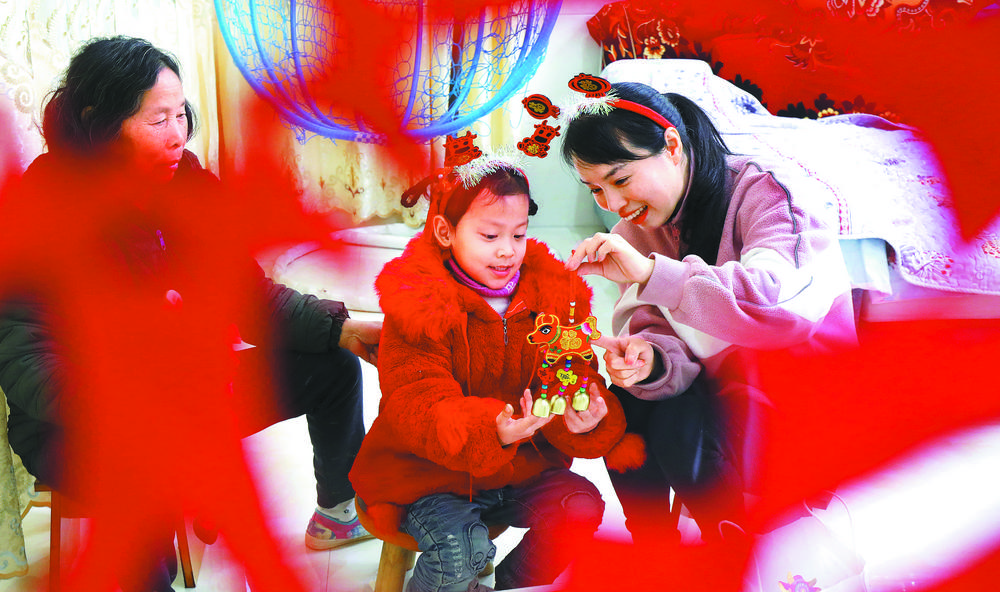 ◀2月5日,江西省宜丰县第二幼儿园幼师徐爱飞(右一)为留守儿童送去新年饰品。春节临近,该县开展“就地过年、暖在身边”关爱行动,为就地过年的外来务工人员送去新春礼包,表达新年祝福。 何贱来摄