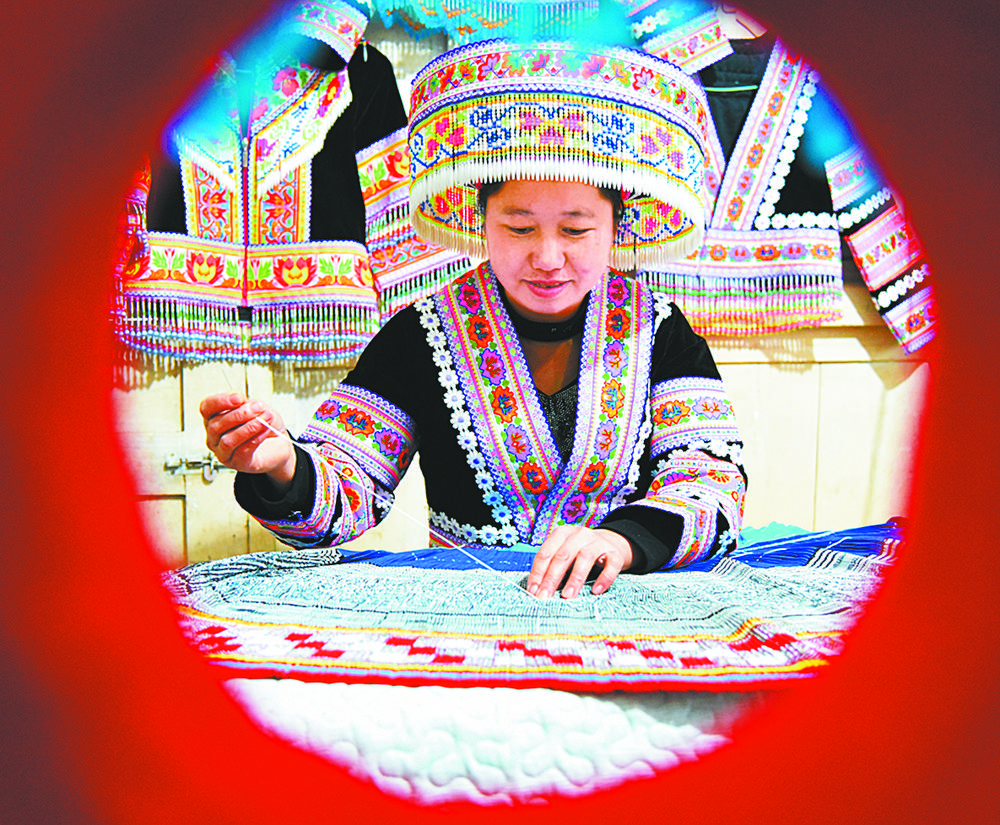 ▲2月3日,贵州省黔西县铁石苗族彝族乡铁盔山村苗寨,苗族同胞杨丽正忙着赶制苗族服装供应市场。 熊军万摄