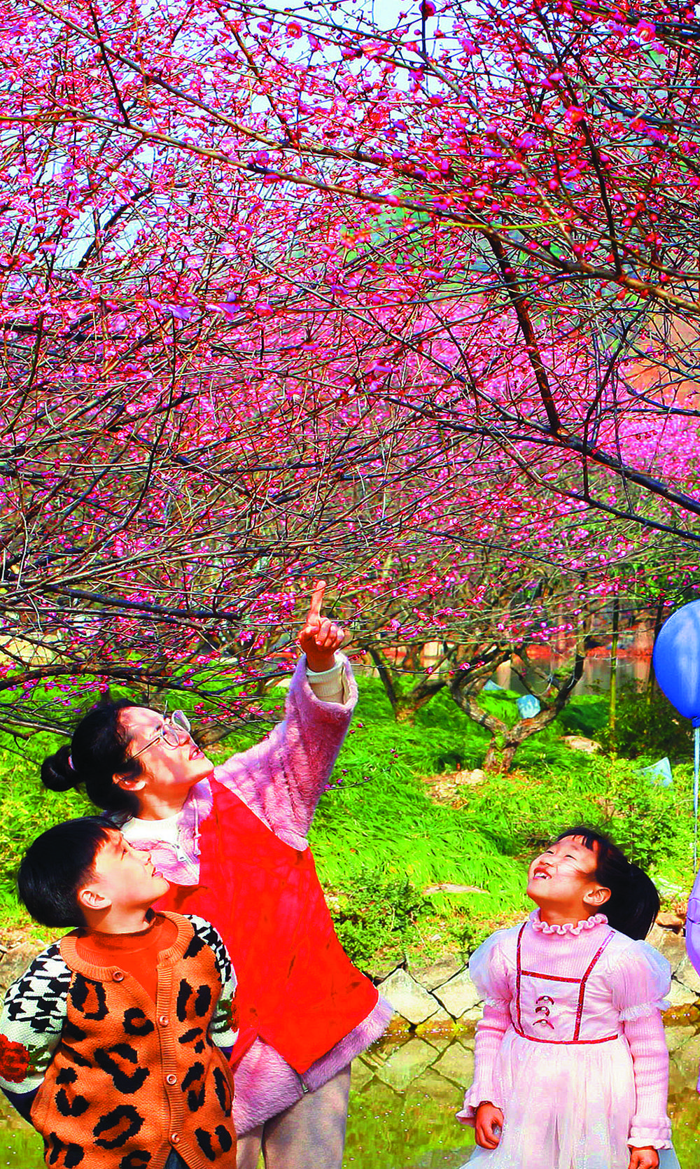 ◀2月3日,浙江省台州市路桥区路桥街道的党员志愿者王盼(中)陪伴留守儿童在公园游玩赏梅。连日来,台州市路桥区开展陪伴“一老一小”活动,让老人和孩子就地过个幸福快乐年。 蒋友亲摄